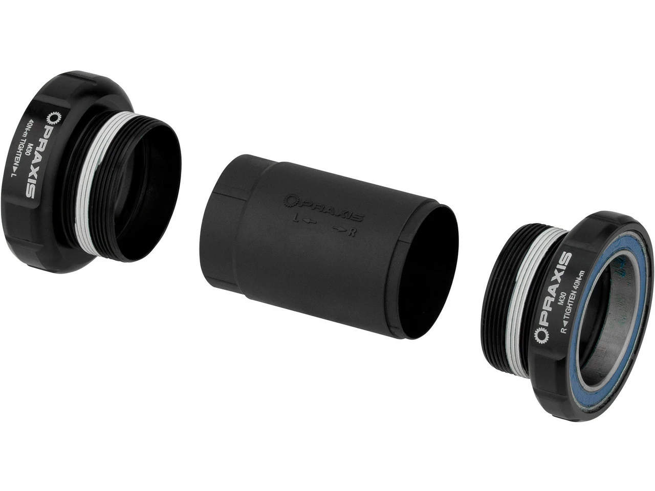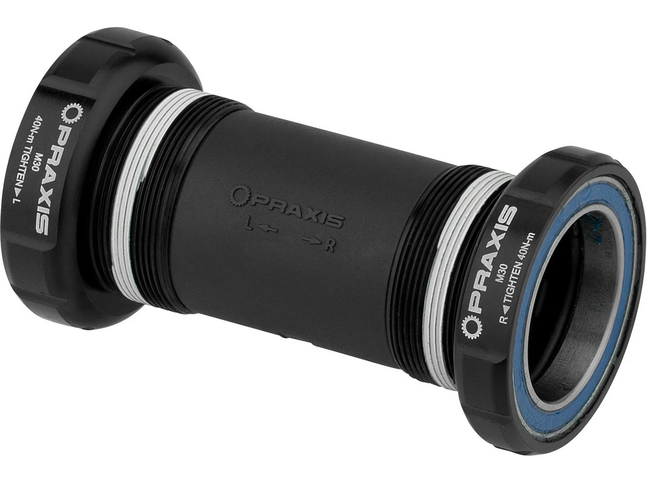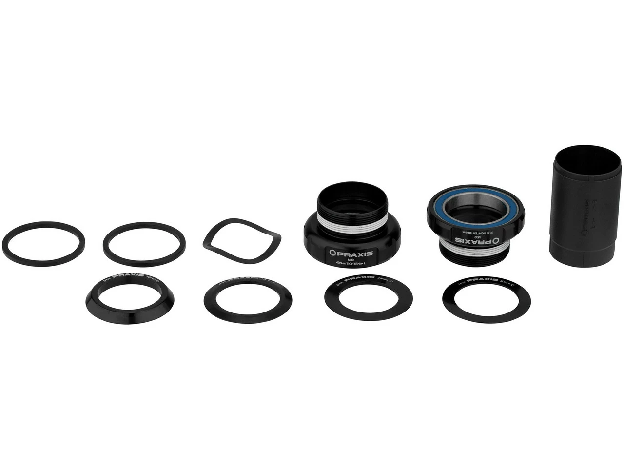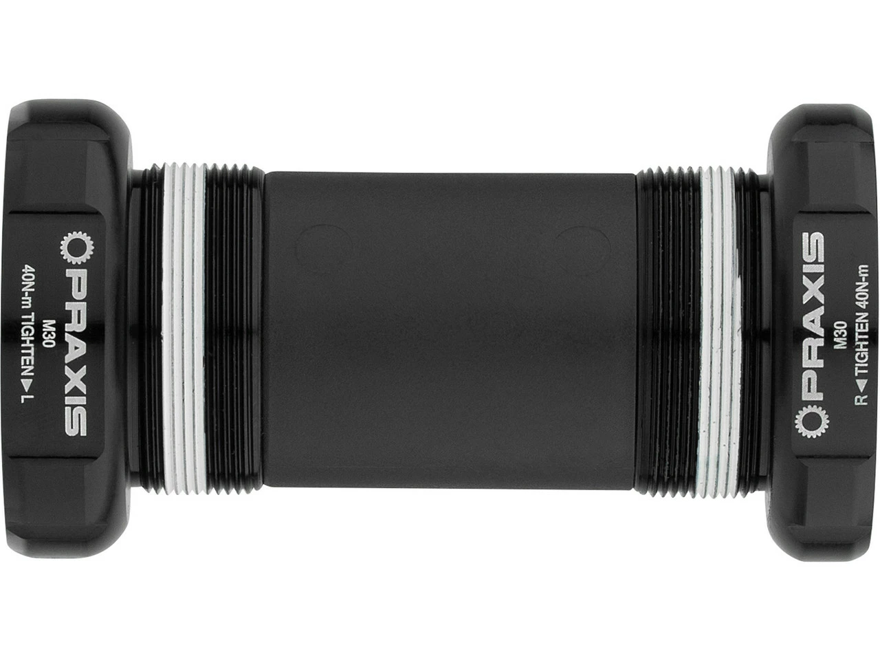 Praxis Works M30 Innenlager sind ausschließlich zur Verwendung mit Praxis Works M30 Kurbeln geeignet. Die M30 Achse entspricht einer Art „Oversize GXP“. Sie ist 30 mm dick und am linken Ende auf 28 mm reduziert, um auf das nicht-antriebsseitige Lager zu passen. Zum Einsatz kommen eine wellenförmige Unterlegscheibe auf der Antriebsseite zur Vorspannung sowie ein 30 mm Lager, dem auf der Nichtantriebsseite ein 28 mm Lager gegenübersteht. M30 kombiniert die Vorteile breiter Lager mit den Vorteilen einer stämmigen 30 mm Achse. Dies ermöglicht einen sicheren Sitz und bessere Kraftübertragung.